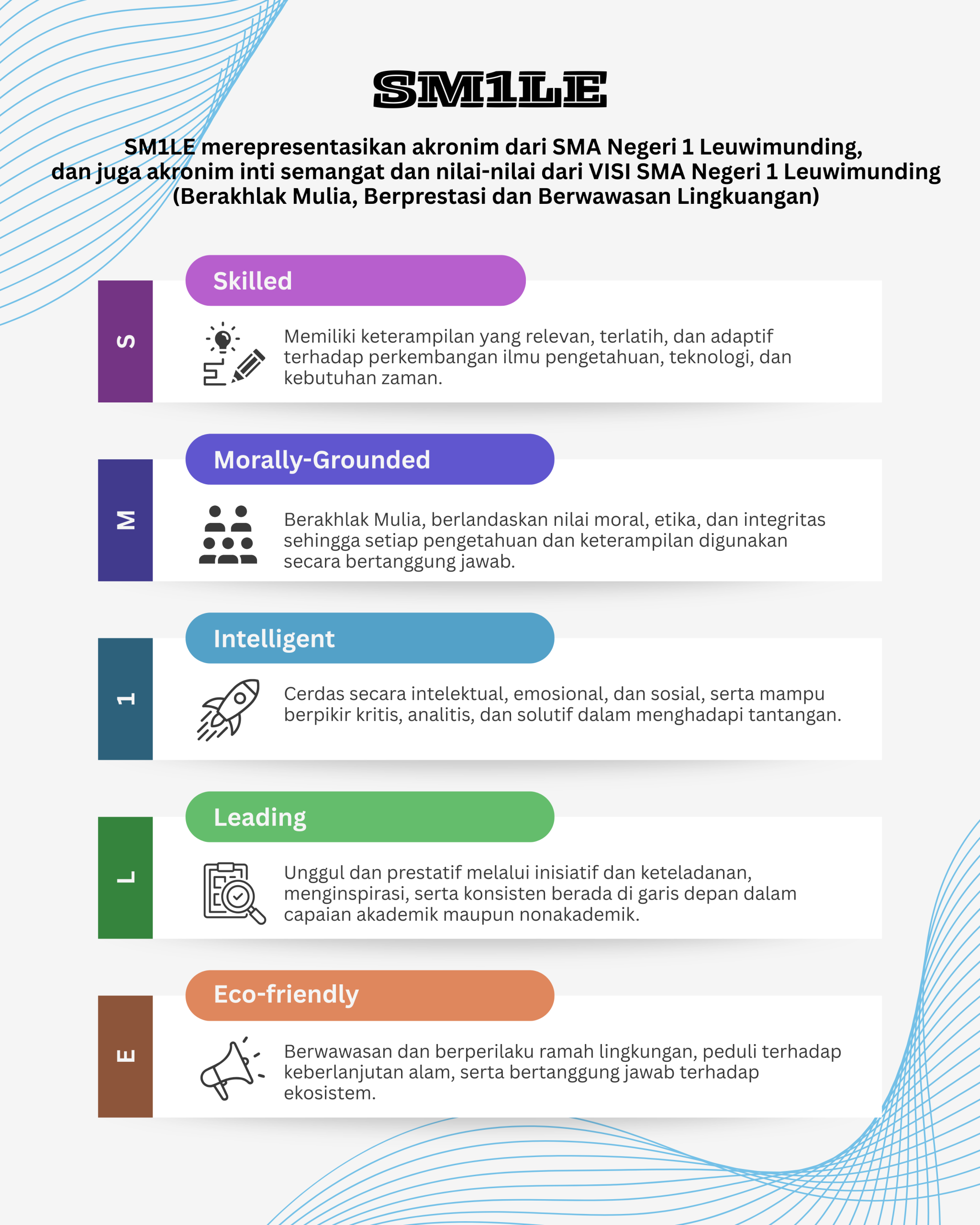 Lebih lanjut, visi SMA Negeri 1 Leuwimunding yang mengutamakan penguatan karakter, pencapaian prestasi, serta kepedulian terhadap lingkungan sejalan dengan nilai-nilai karakter Pancawaluya, yaitu cageur, bageur, bener, pinter, dan singer. Nilai-nilai tersebut menjadi Standar Kompetensi Lulusan Pelajar Jawa Barat yang menekankan terbentuknya peserta didik yang sehat jasmani dan rohani, berakhlak mulia, berperilaku jujur dan benar, cerdas secara intelektual, serta terampil dan adaptif dalam menghadapi tantangan zaman.